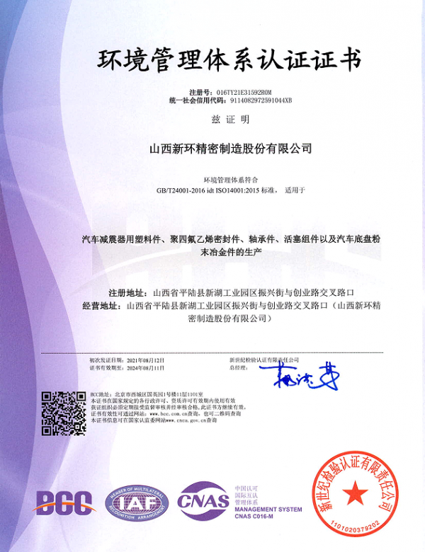 • 環(huán)境體系證書